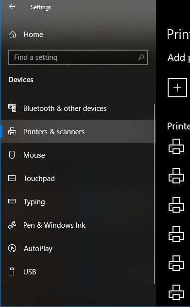 Next, go to the Settings menu in Windows 10, select Devices, and select Printers & Scanners on the left-hand menu.